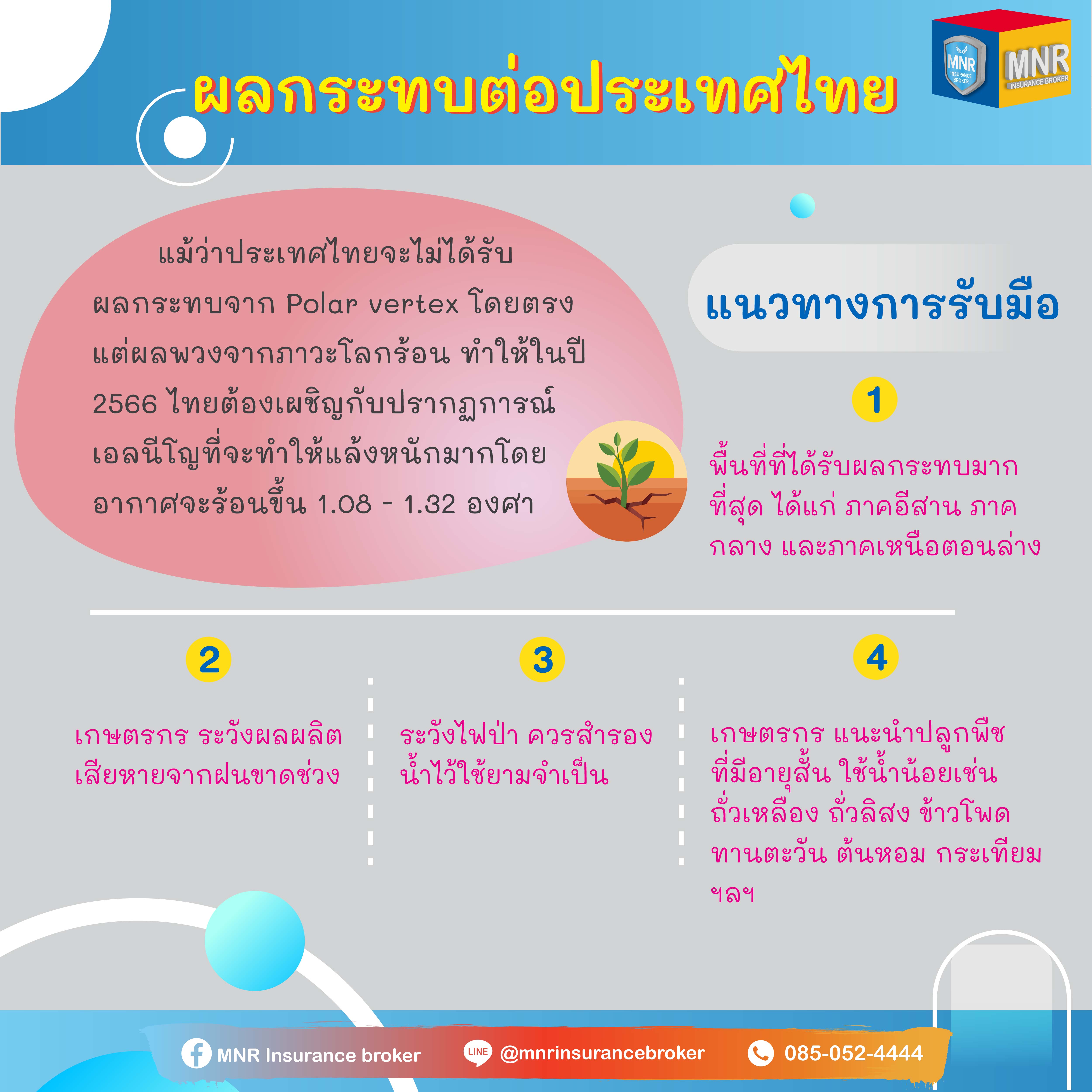 แม้ว่าประเทศไทยจะไม่ได้รับผลกระทบจาก Polar vertex โดยตรง แต่ผลพวงจากภาวะโลกร้อน ทำให้ในปี 2566 ไทยต้องเผชิญกับปรากฏการณ์เอลนีโญที่จะทำให้แล้งหนักมากโดยอากาศจะร้อนขึ้น 1.08 - 1.32 องศา