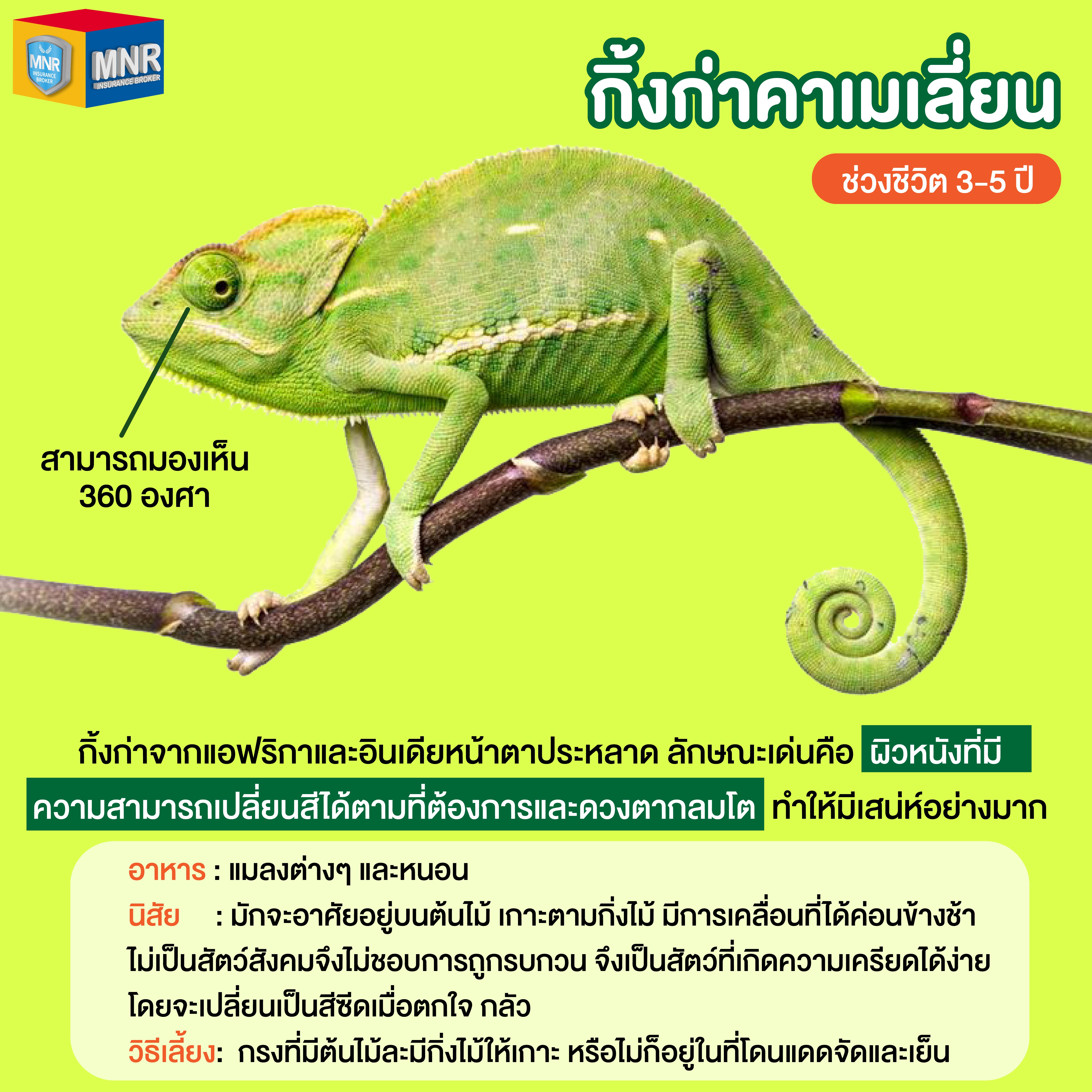 ‘กิ้งก่าคาเมเลี่ยน’ กิ้งก่าจากแอฟริกาและอินเดียหน้าตาแปลกประหลาด มีลักษณะเด่น คือ ผิวหนังที่มีความสามารถในการเปลี่ยนสีได้ตามต้องการ และดวงตาอันกลมโตทำให้ดูมีเสน่ห์เป็นอย่างมาก จนมีหลายคนหลงใหลในความพิสดารและนิยมเลี้ยงกันอย่างมากมาย เรียกได้ว่าเป็น สัตว์เลี้ยงแปลกที่ฮิตถึงกับมีคนนำไปสร้างเป็น Animation ชื่อดังอย่าง Rango