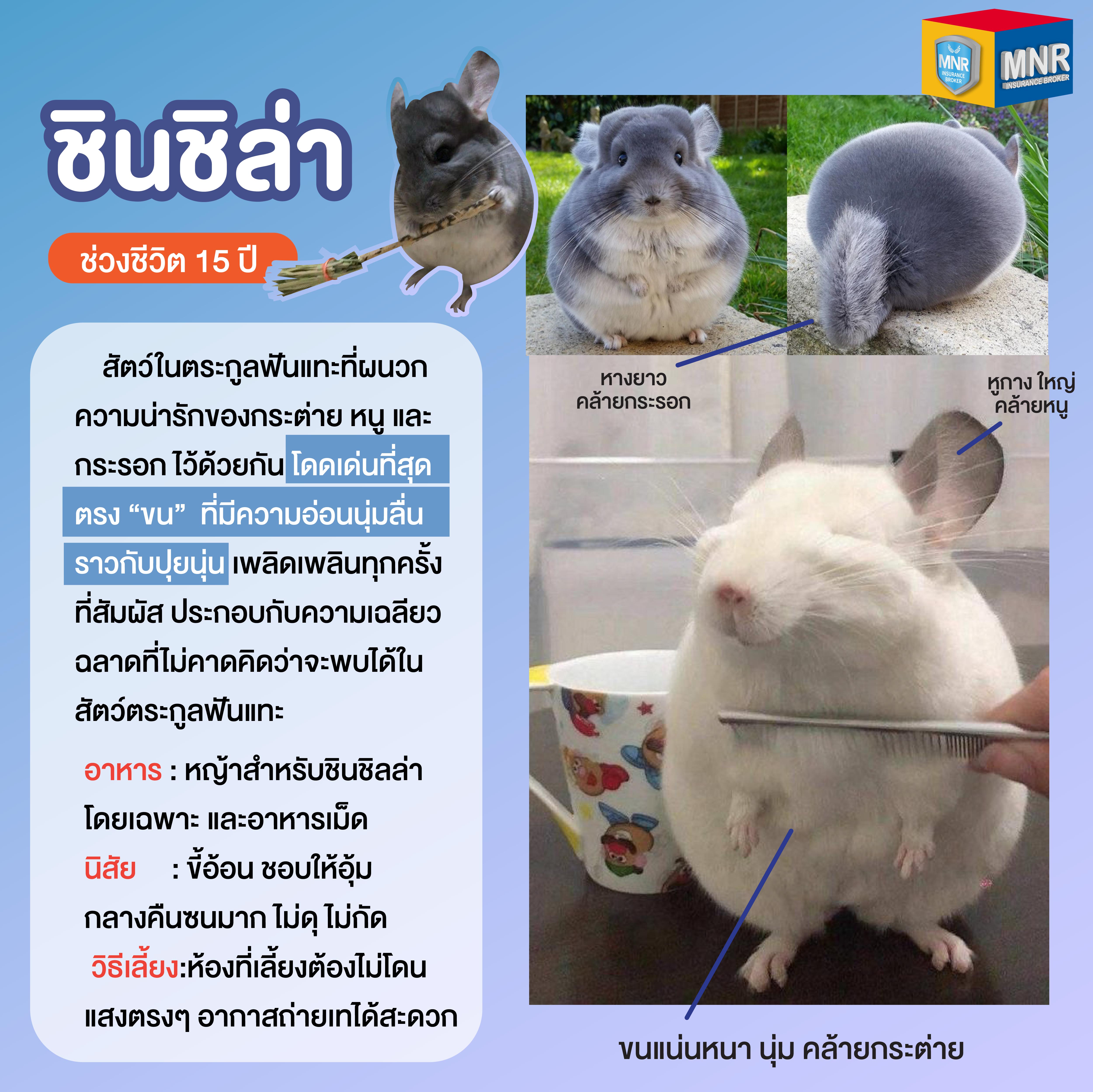 น้องมาเป็นก้อน เหมือนลูกครึ่งระหว่างกระต่ายผสมกับหนู ชินชิลล่า สัตว์เลี้ยงที่คนไทยนิยมเลี้ยงมากขึ้นเรื่อยๆ เป็นสัตว์ฟันกัดแทะ มีลักษณะขนที่แน่น หนาและนุ่มมาก โดยมีนิสัยรักความสะอาด เรื่องที่อยู่อาศัยผู้คนมากเข้าใจผิดว่าต้องอยู่ในห้องปรับอากาศตลอดเวลาเพราะอาจจะเห็นว่าน้องมีขนหนาแน่นและหางที่ยาว แต่ในความเป็นจริงแล้วชินชิลล่าควรอาศัยอยู่ในบริเวณที่ การถ่ายเทอากาศได้ดี ไม่อับชื้น มีลมผ่าน สามารถเรียนรู้ได้เหมือนแมวในเรื่องของการขับถ่ายให้เป็นที่เป็นทาง สีของเจ้าตัวนี้มีทั้งหมด 7 สี