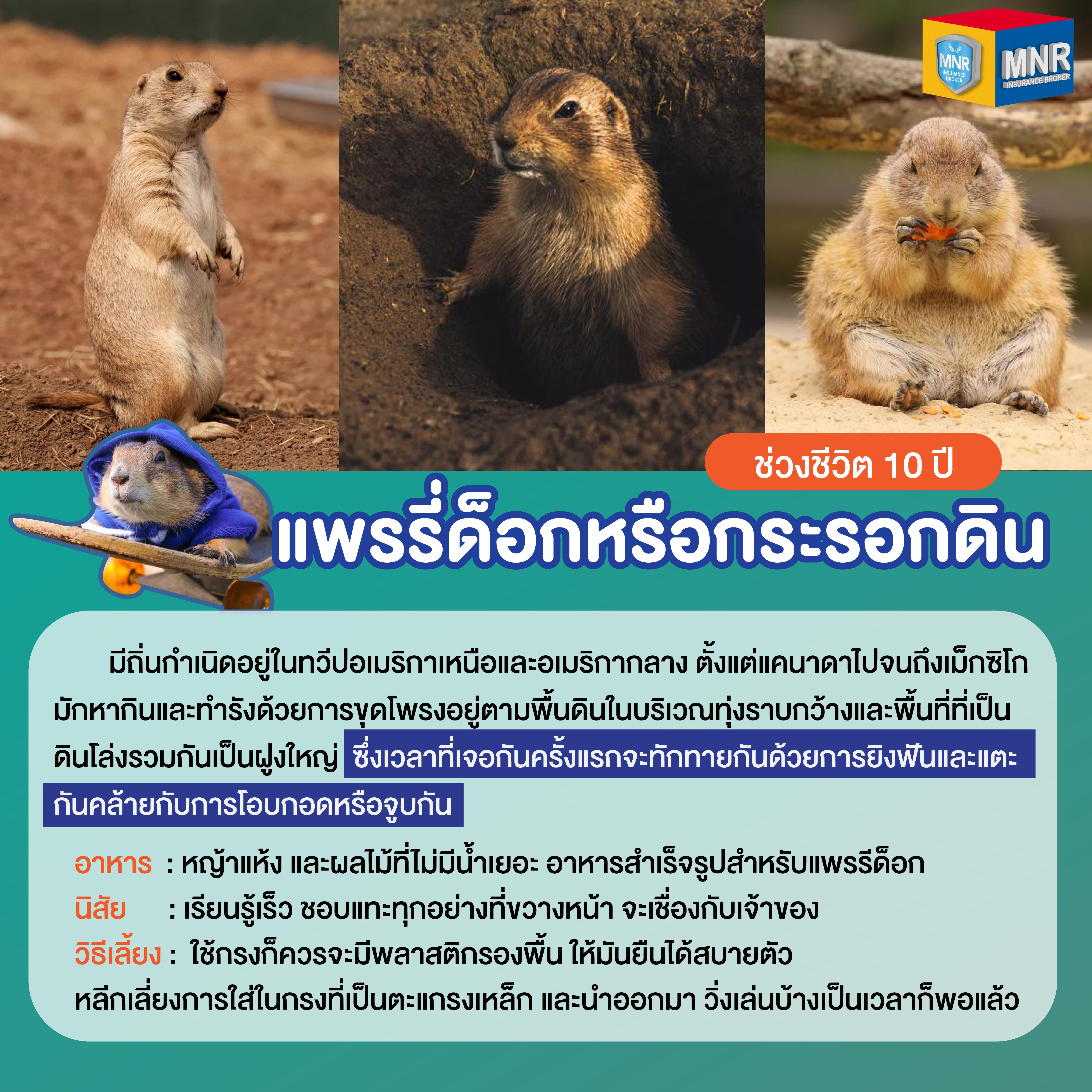 ‘แพรรี่ด็อก’ เป็นสัตว์ตระกูลกระรอก ที่มีนิสัยชอบอาหารและสร้างโพรงภายในดิน ทำให้มันได้รับฉายาว่ากระรอกดิน พวกมันมีลักษณะที่คล้ายกับหมีตัวจิ๋ว ๆ หนักเพียง 1-2 กิโลกรัม ชอบเข้าสังคมและมีราคาที่ไม่แพงมากนัก และจุดเด่นอีกอย่างหนึ่งของสัตว์เลี้ยงคือมีเสียงร้องที่คล้ายกับสุนัข ซึ่งเป็นที่มาของชื่อแพรรี่ด็อกนั่นเอง จัดเป็นสัตว์เลี้ยงลูกด้วยนมที่มีฟันแทะ ขนสั้นสีน้ำตาลอ่อน ใบหูเล็ก ดวงตากลมโต ฟันแข็งแรง ชอบยืนสองขา หางไม่ยาวนัก