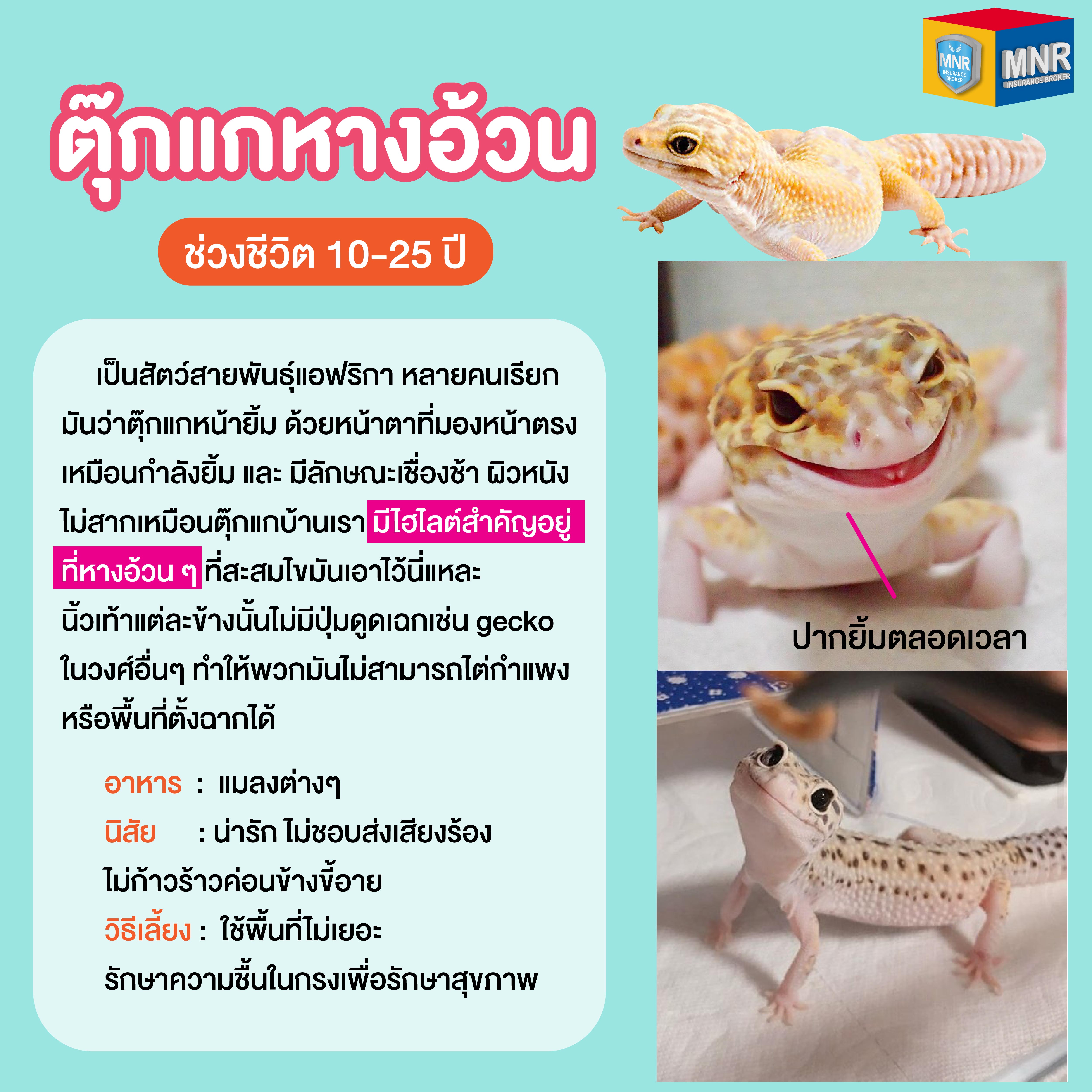 ตุ๊กแกหางอ้วน เป็นสัตว์สายพันธุ์แอฟริกา หลายคนเรียกมันว่าตุ๊กแกหน้ายิ้ม ด้วยหน้าตาที่มองหน้าตรงเหมือนกำลังยิ้ม และมีลักษณะเชื่องช้า ผิวหนังไม่สากเหมือนตุ๊กแกบ้านเรา มีไฮไลต์สำคัญอยู่ที่หางอ้วน ๆ ที่สะสมไขมันเอาไว้นี่แหละ