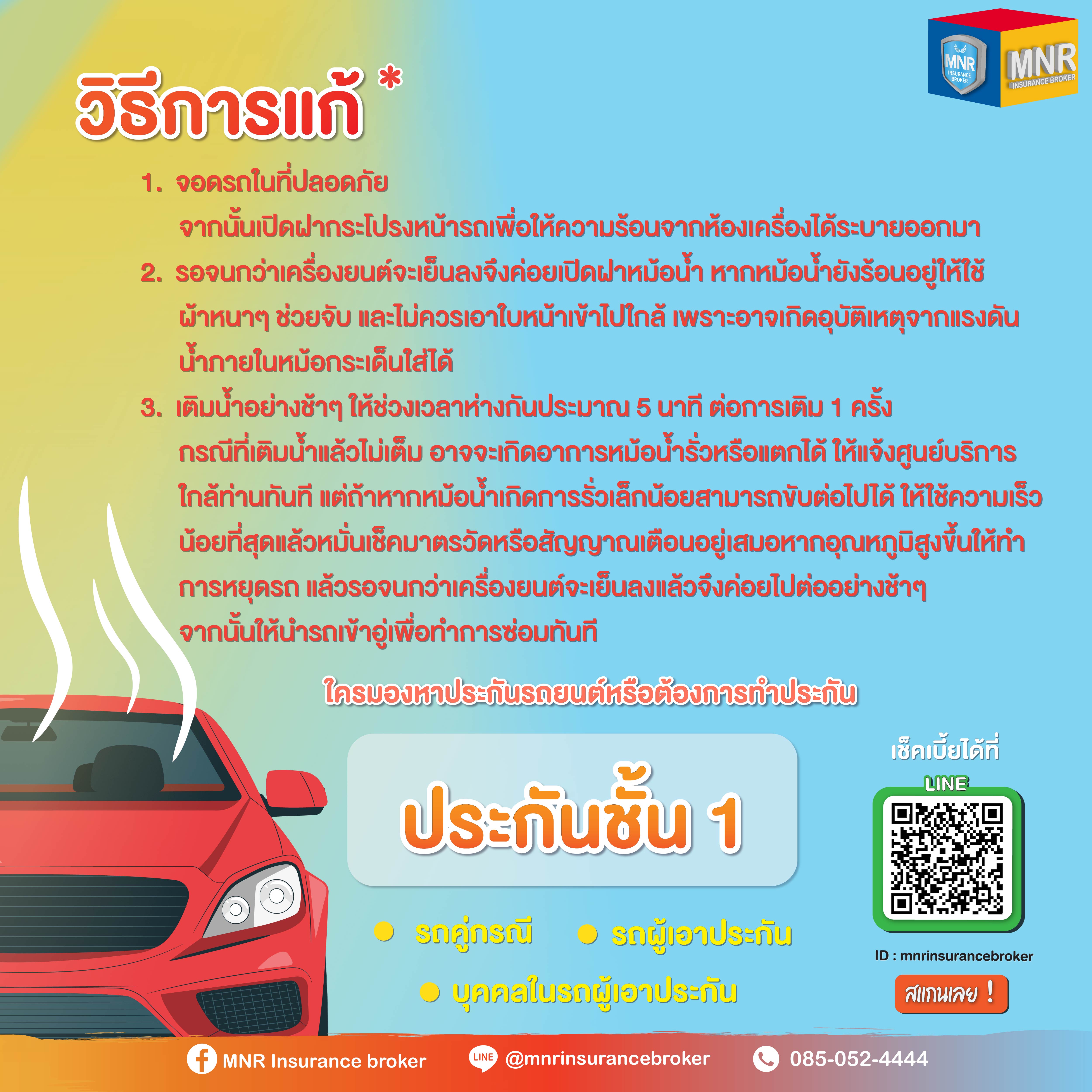 หรือการทำประกันภัยรถยนต์ก็เป็นสิ่งสำคัญในการคุ้มครองรถยนต์ของคุณได้ไม่ว่าจะเป็น ประกันชั้น 1 ที่ดูแลครบ จบทุกความต้องการหรือ ประกันรถยนต์ 2+ ซื้อง่ายคุ้มครองเร็ว หรือประกันรถยนต์ 3+ ประกันคุ้มจบในที่เดียว และใครที่กำลังมองหาการต่อ พรบ.รถยนต์ที่คุ้มค่า สนใจทำประกันนึกถึง MNR Insurance Broker บริการ 24 ชั่วโมง ให้คำแนะนำและคำปรึกษาได้ทุกเรื่อง หรือโทรสอบถามข้อมูลได้ที่ 085-052-4444