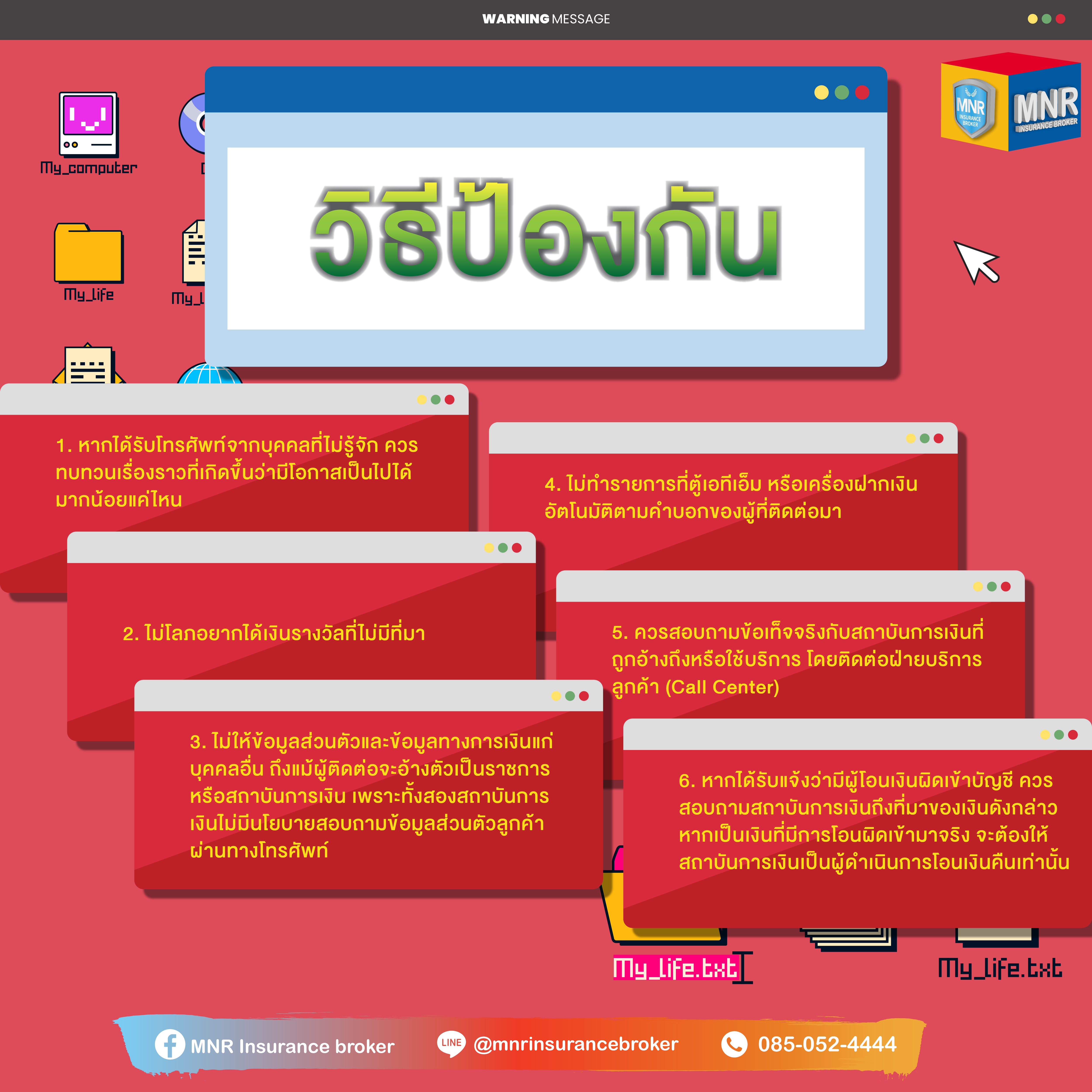 3. ไม่ให้ข้อมูลส่วนตัวและข้อมูลทางการเงินแก่บุคคลอื่น ถึงแม้ผู้ติดต่อจะอ้างตัวเป็นส่วนราชการหรือสถาบันการเงิน เพราะส่วนราชการและสถาบันการเงินไม่มีนโยบายสอบถามข้อมูลวนตัวลูกค้าผ่านทางโทรศัพท์