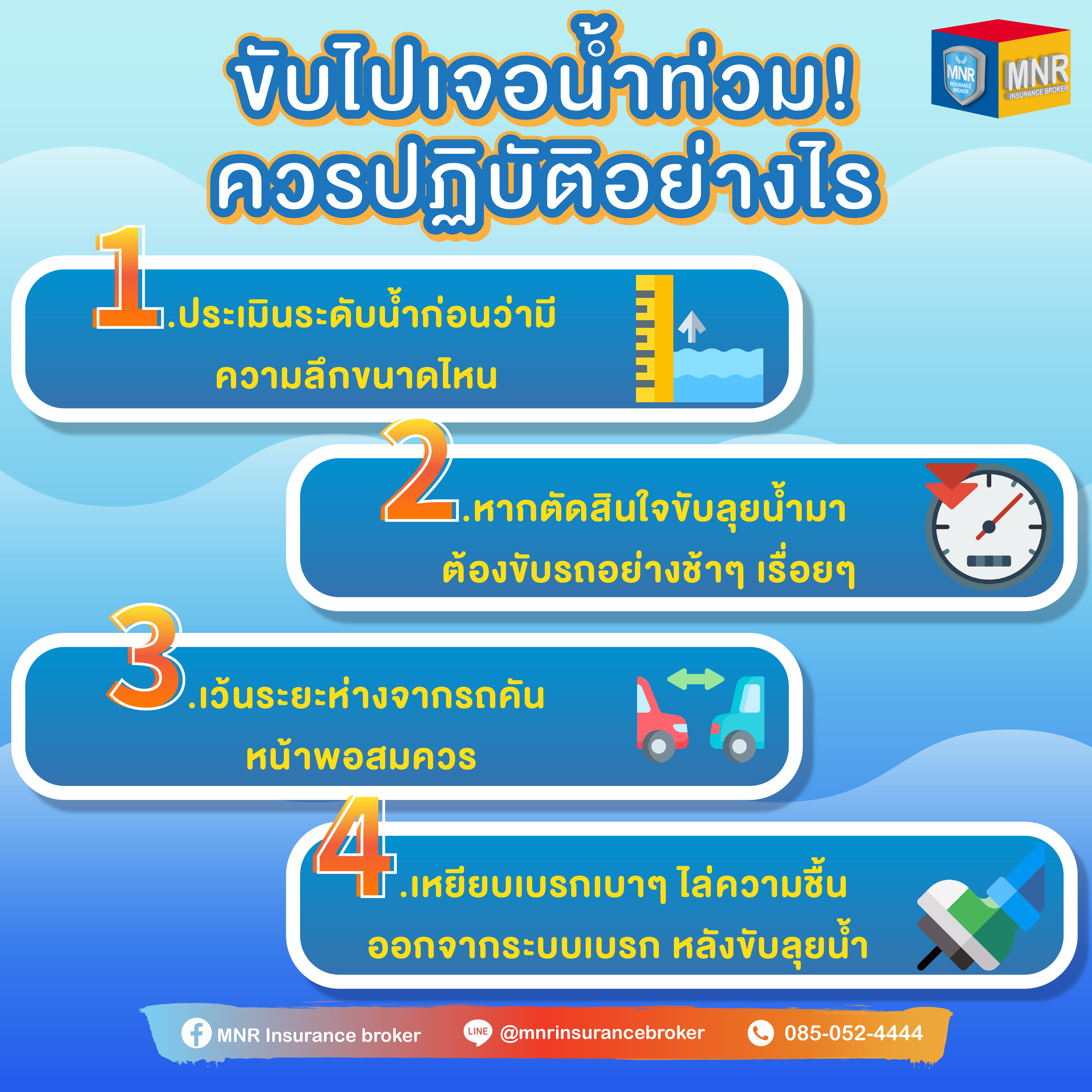 3. เว้นระยะห่างจากรถคันหน้าพอสมควรและเมื่อมีรถคันอื่นสวนทางมาก็ต้องลดความเร็วเพื่อป้องกันไม่ให้ระลอกน้ำเข้ามาในเครื่องยนต์ ทำให้เสียหายได้