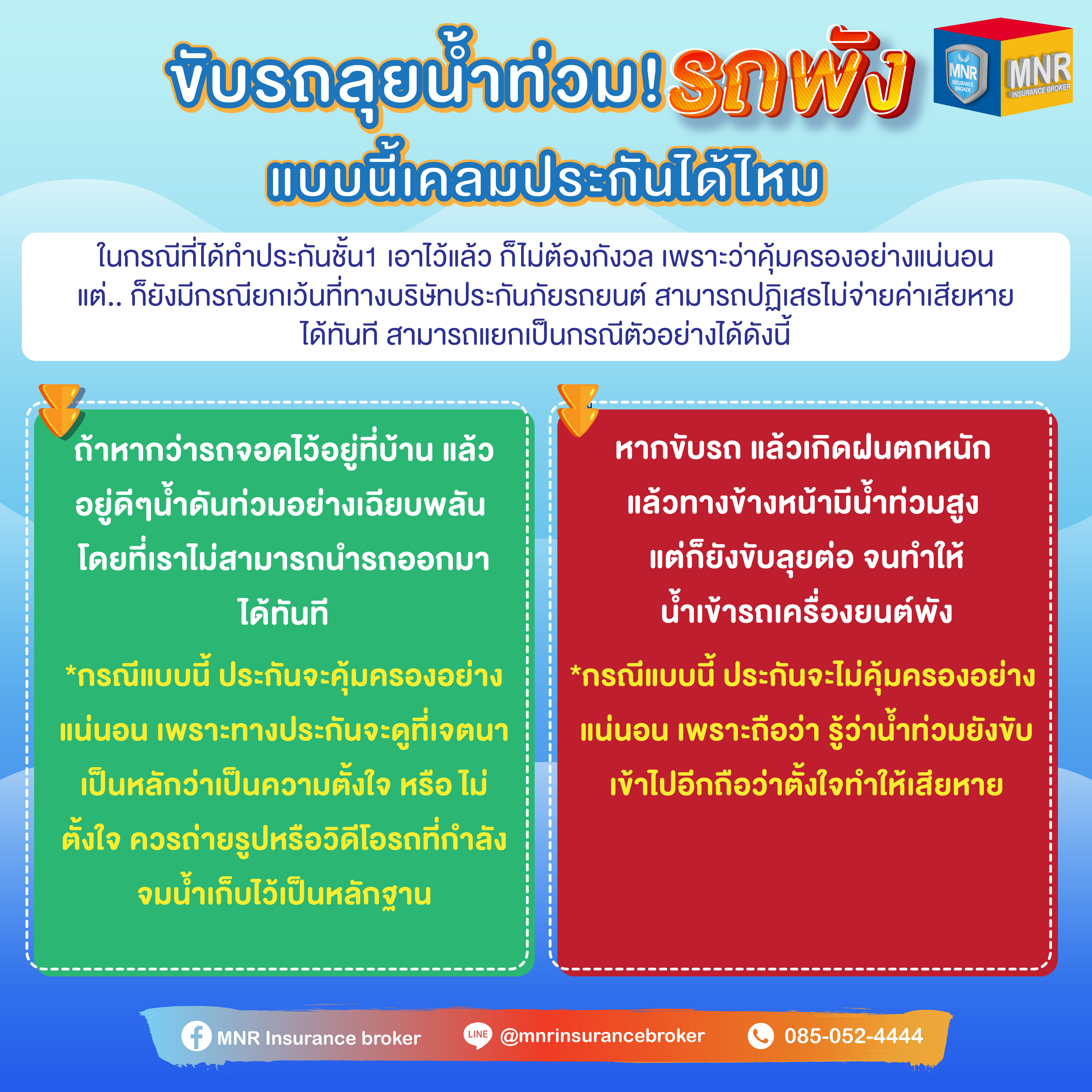 - หากขับรถ แล้วเกิดฝนตกหนัก แล้วทางข้างหน้ามีน้ำท่วมสูง แต่ก็ยังขับลุยต่อ จนทำให้น้ำเข้ารถเครื่องยนต์พัง : *กรณีแบบนี้ ประกันจะไม่คุ้มครองอย่างแน่นอน เพราะถือว่ารู้ว่าน้ำท่วมยังขับเข้าไปอีกถือว่าตั้งใจทำให้เสียหาย