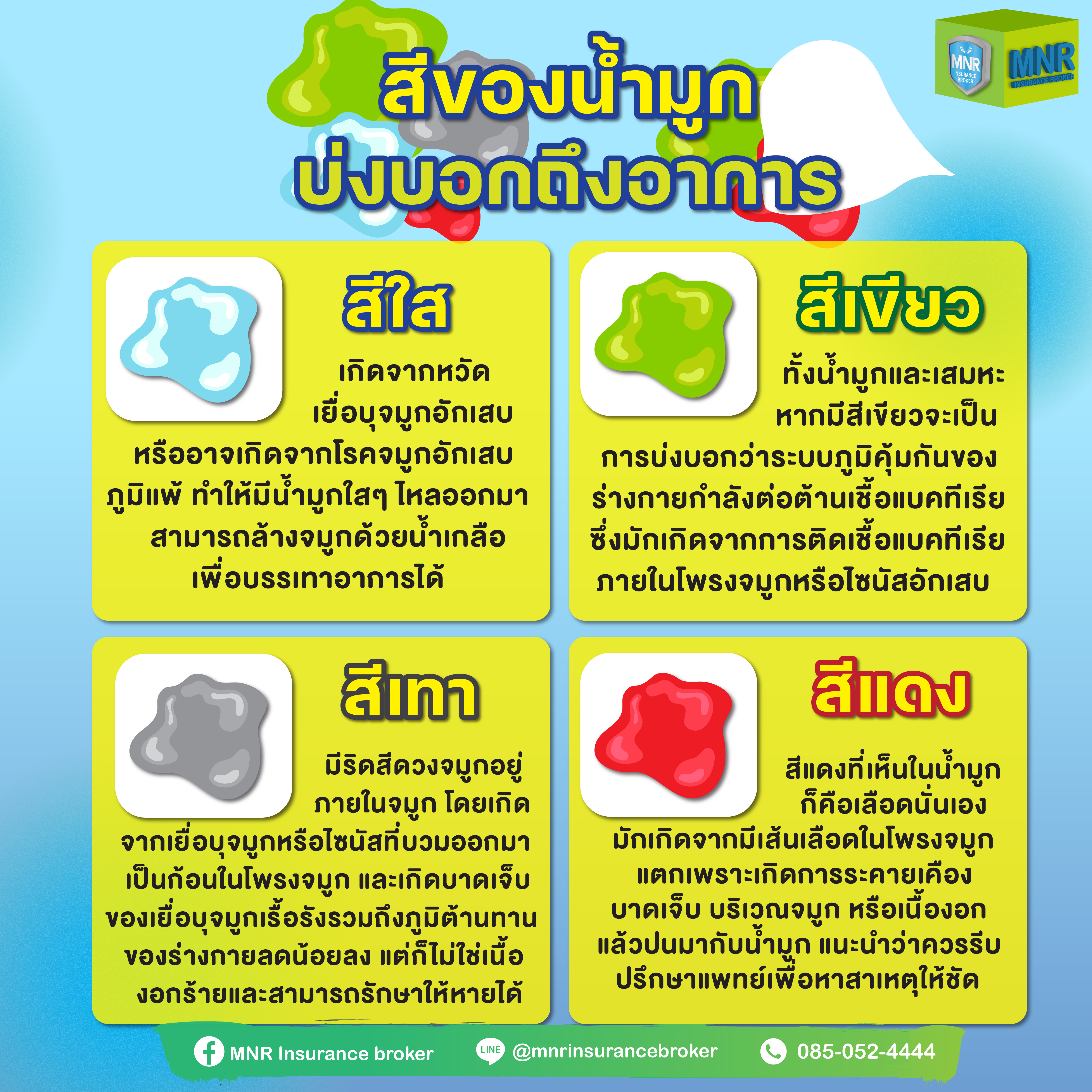 สีของน้ำมูกไม่ใช่แค่บ่งบอกโรคได้เท่านั้นแต่ยังเป็นสัญญาณความผิดปกติจากภายในร่างกายของเรา ที่อาจหมายถึงการเจ็บป่วย การรับเอาสิ่งผิดปกติเข้าไปในร่างกาย หรือการติดเชื้อไวรัสและเชื้อแบคทีเรียต่างๆ เพราะฉะนั้นอย่ามองข้ามสัญญาณจากสีแบบต่างๆ ของน้ำมูกนะคะ นอกจากนี้วิธีการที่ดีที่สุดก็คือการป้องกันตัวเองเอาไว้ก่อนด้วยการเสริมภูมิคุ้มกันให้ร่างกาย ทั้งการออกกำลังกาย การนอนหลับ และการเลือกกินอาหารที่มีประโยชน์ หรือมีประกันสุขภาพไว้ติดตัว อุ่นใจให้เราละคนในครอบครัว สนใจทำประกัน MNR Insurance Broker ยินดีให้คำปรึกษาบริการ 24 ชั่วโมง โทรสอบถามข้อมูลได้ที่ 085-052-4444
