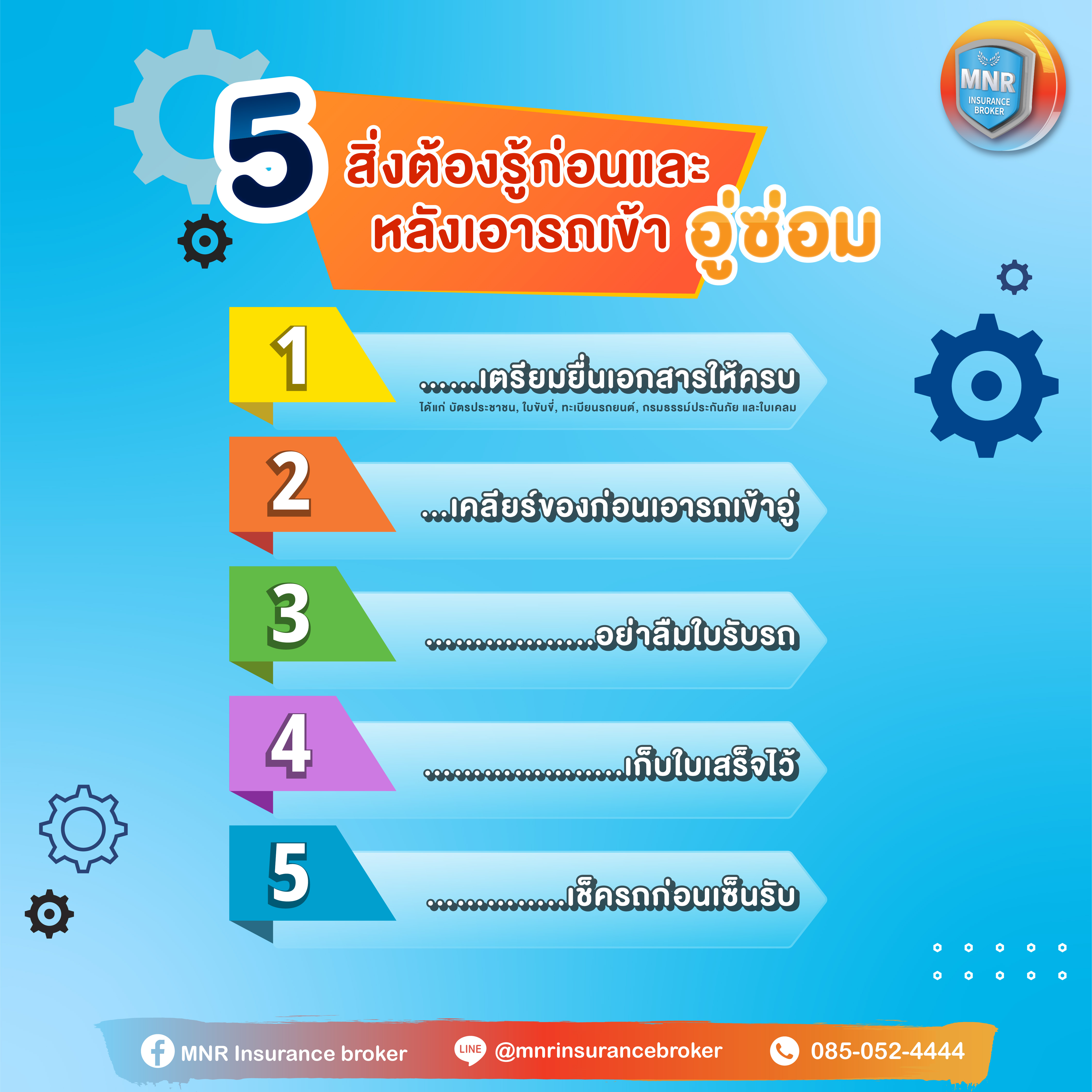 จะซ่อมรถแต่ละที ต้องนำรถเข้าอู่ทั้งหมดสองรอบ โดยรอบแรกเป็นรอบยื่นเอกสาร และตรวจสอบสภาพรถ เพื่อให้อู่ทำเรื่องเสนอราคากับทางประกัน โดยใช้เวลาประมาณ 3-5 วัน ถ้าทุกอย่างเรียบร้อยดี ทางอู่จะโทรมาแจ้ง และนัดซ่อมจริงในรอบถัดไป โดยเอกสารที่ต้องใช้มีทั้งหมด 5 อย่าง คือ บัตรประชาชน, ใบขับขี่, ทะเบียนรถยนต์, กรมธรรม์ประกันภัย ที่สำคัญที่สุด อย่าลืมใบรับรองความเสียหาย หรือ ใบเคลม นั่นเอง